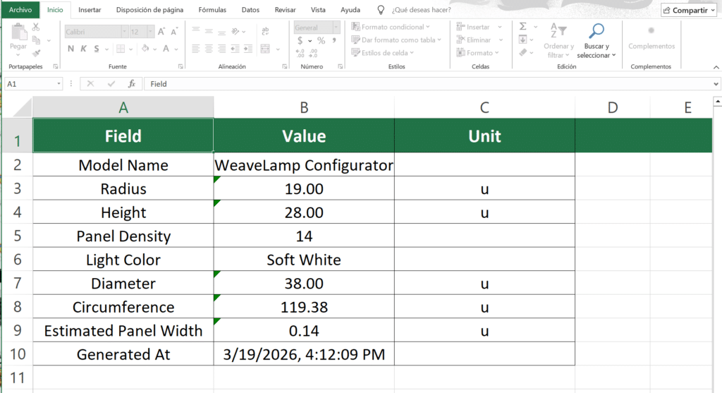 These values can be exported as CSV or Excel files, connecting parametric customization to fabrication-oriented decision making.