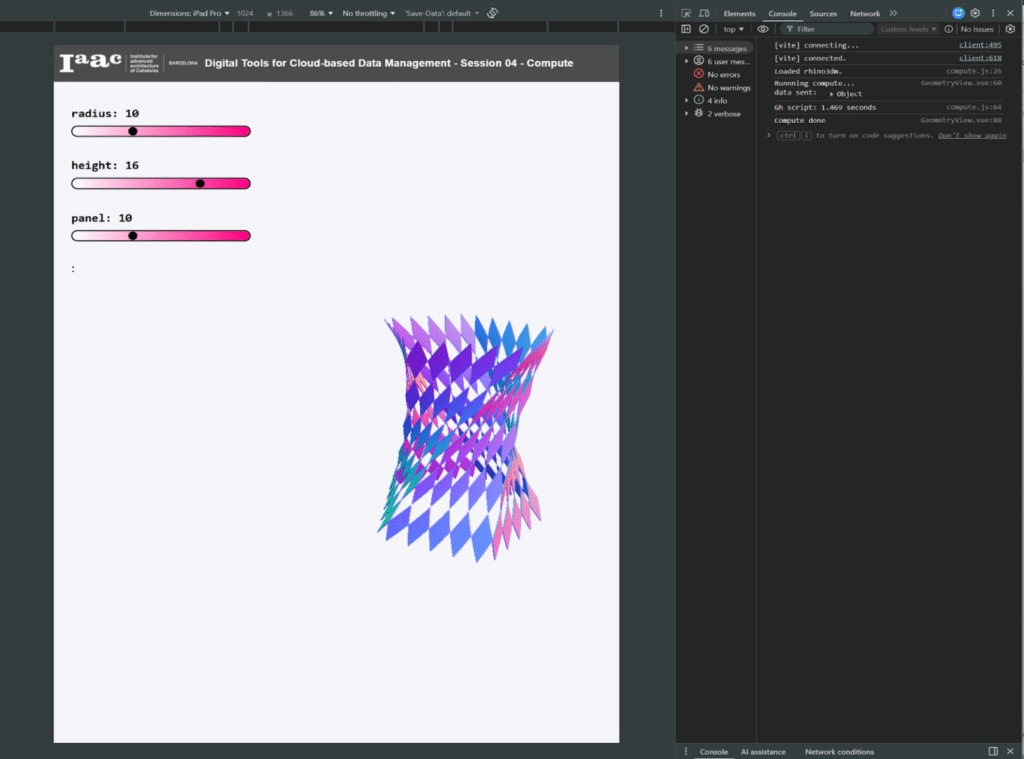 Users adjust radius, height, and panel density, run the Grasshopper definition through Rhino.Compute, and receive updated geometry together with fabrication-related information.