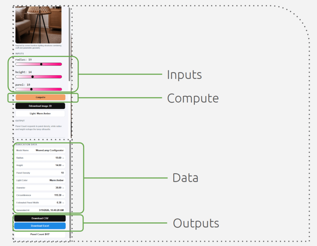 The interface is structured around a simple user flow: parameters are adjusted, the definition is computed through Rhino.Compute, and the updated geometry and data are returned to the browser.