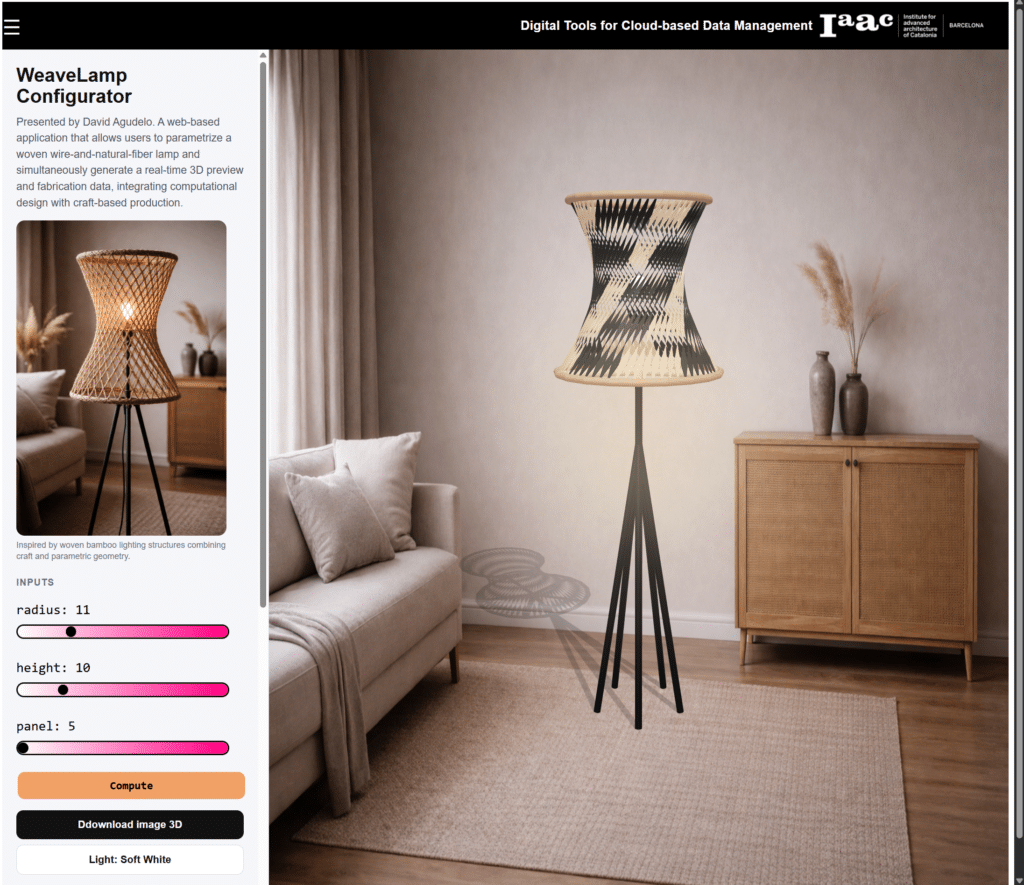 WeaveLamp Configurator is a web-based application that brings a Grasshopper workflow into an accessible browser-based experience. The project explores how a craft-inspired lamp system can be translated into a clear digital tool for customization, spatial visualization, and fabrication-oriented output.