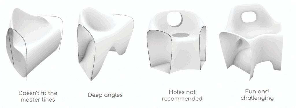 As a design constraint, we were given a set of master lines that enabled all the chairs fabricated by the class to be connected in a circular pattern. Other than that, we were encouraged to go as crazy as we can in terms of our chair geometries. We started by developing several design iterations and selected the one that excited us the most. See Figure 1. The idea of putting holes on a chair stemmed out of a toilet seat concept for a dry composting toilet. Realizing that such extreme angles at its small size cannot be reached by the robot’s huge spindle, we reluctantly settled with just putting one hole on the backrest and adding some bumps behind the chair just for fun. We did not design our chair to be comfortable.
